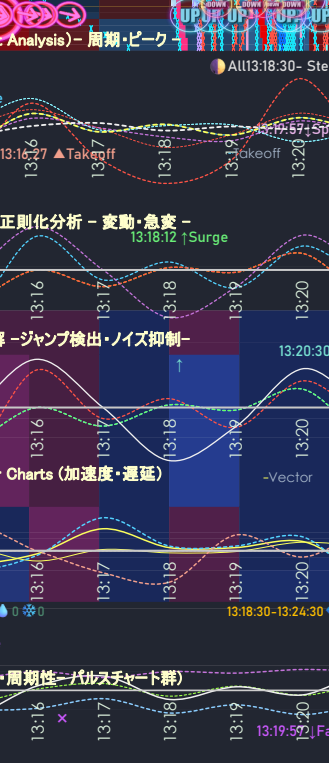 「アルゴリズムに立ち向かう! 多重時間スケールによる市場分析レポート」では、さらに精緻なクラスタリング分類に基づき、AIが解析した数値データを配信。上記アルゴリズムのパターン検出や逆方向アラートを含むチャート群・アラート群により、より多角的かつ実践的な市場判断を支援する構成となっております。